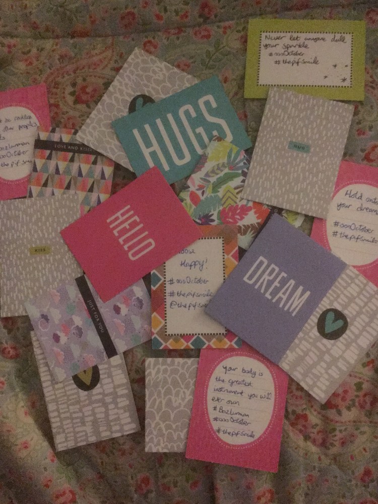 One of the first things that I started to create were affirmation cards. Little notes with uplifting things written on them. My plan was to leave them around in various places for people to find. A little note in the day to act like the sun poking through the clouds. I was given this idea by a wonderful human called Jodie Ann Bickley who runs “one million lovely letters” She struggles with her Mental Health like I do, and decided to create something beautiful to help other people. She is a badass mental health advocate that is her authentic, beautiful self. If she is having a bad day, she will talk about it in the hope that it will make someone else feel less alone.